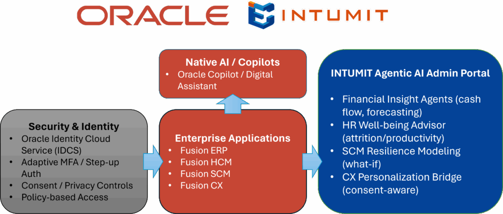 Oracle + INTUMIT:聚焦 Fusion ERP/HCM/CX/SCM 強化 Oracle Fusion(Oracle Fusion Cloud)- INTUMIT 企業級 AI 與工業級 AI 解決方案 Oracle x INTUMIT 的 AI 驅動財務與採購 INTUMIT 與 Oracle 為財務結帳、採購與規劃流程提供自動化與智慧能力。INTUMIT 可與 Oracle Fusion Cloud、E-Business Suite 及 Autonomous Database 協同運作,協助企業加速報表週期、提升預測準確度,並簡化供應商導入流程。INTUMIT 可為 EPM 產生敘述型報告,於說明內容時提供相關連結參考,並撰寫採購摘要,為您的企業級 AI 與工業級 AI 解決方案創造更高價值。 具備 ERP 信任審批的財務 Agent 透過 Agentic AI 管理後台,Oracle Fusion ERP 中的財務審批流程受到自適應多因素驗證(Adaptive MFA)保護,確保僅有授權行為得以執行。結合預測模擬擴展 Fusion ERP Copilot,可主動提供現金流影響與專案延誤風險的建議,協助財務主管更有信心地決策。 HCM Agent,人資顧問 Fusion HCM 透過 Oracle Identity Cloud Service(IDCS),確保僅有經驗證的使用者角色能存取並採取人資建議。透過將員工訊號與生產力及流動率預測進行關聯分析,為人資主管提供可信且以數據為基礎的洞察,做出更精準的人力決策。 具備驗證機制的 SCM Agent CX Copilot 與 IDCS 結合 Agentic AI 管理後台 Fusion SCM Agent 可執行情境模擬,例如供應商中斷或運輸路線變更,但僅在物流主管完成進階驗證後才會實際執行動作。透過 Agentic AI 管理後台進行多 Agent 編排,提供最佳化建議,強化供應鏈韌性與決策品質。 Fusion CX Copilot 僅使用具備 Oracle Identity Cloud Service(IDCS)中已驗證同意紀錄的客戶資料。透過串聯 ERP、HCM 與 SCM 資料,搭配 Agentic AI 管理後台,實現跨企業的端到端個人化客戶旅程。 客製化 AI Copilot 與 AI Agent 解決方案(Agentic AI) 建立並嵌入提示,結合 RAG 與推理流程,同時安全保護個人資料與隱私。 多元生成式 AI 解決方案 語意搜尋、語音互動、多語言支援、自動化文件產生,以及其他量身打造的 AI 解決方案。 全通路延伸與支援 支援 Teams、Slack、LINE、FB Messenger、Zalo、WhatsApp、IVR、語音機器人、虛擬分身等多元通路。 聯絡我們以取得更多資訊! ORACLE x INTUMIT