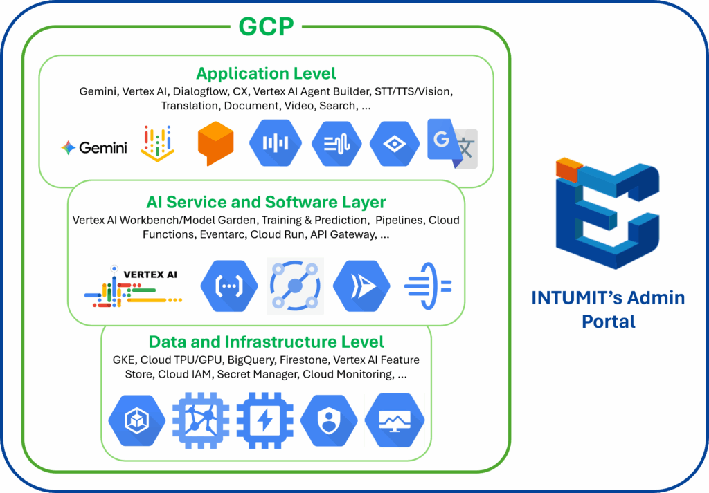 INTUMIT 與 Google 雲端平台 合作,在企業環境中提供智慧、可擴展的 AI 解決方案。透過整合 GCP 的先進工具,如 Gemini、Vertex AI、Dialogflow CX,我們打造多語言對話代理、流程自動化,並提升多通路的客戶互動。